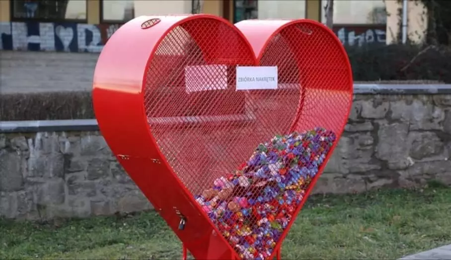 Obok Domu Kultury w Koszęcinie został zamontowany kosz w kształcie serca przeznaczony do zbiórki nakrętek, które będą przekazywane na cele charytatywne dla chorych dzieci. Pomysłodawczynią była mieszkanka Gminy Koszęcin.