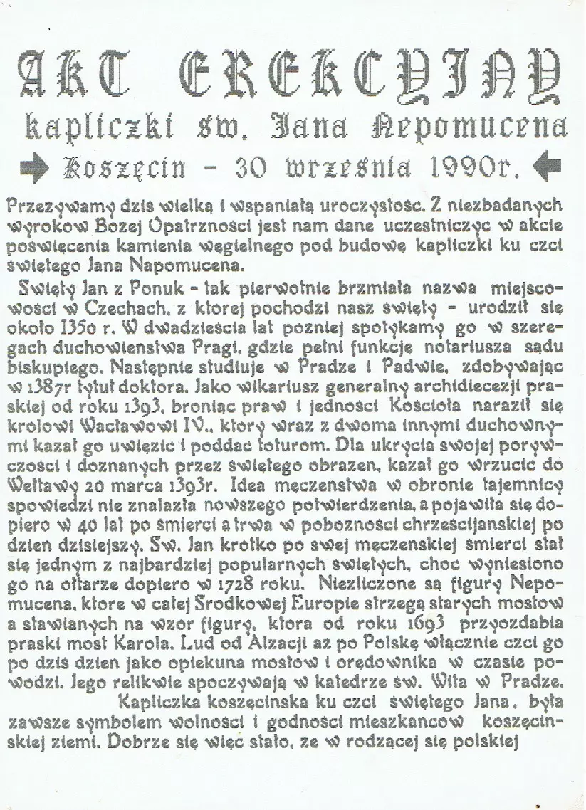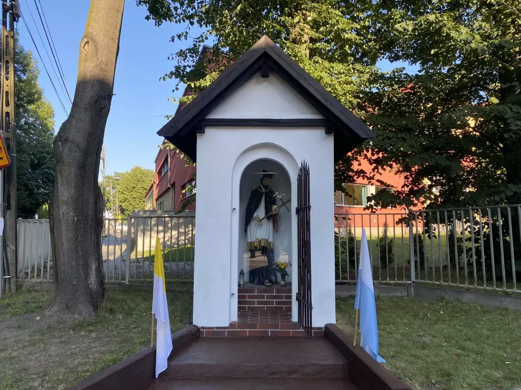 Kapliczka św. Jana Nepomucena stoi na skrzyżowaniu ulic Sobieskiego i Szkolnej. Aktualna nie liczy sobie setek lat, chociaż traktujemy ją historycznie, bowiem na tym miejscu od niepamiętnych czasów stał taki obiekt. Zachęcamy do przeczytania pełnej informacji sporządzonej przez Jana Myrcika i zapisanej w postaci niżej zamieszczonego Aktu erekcyjnego kapliczki św. Jana Nepomucena - Koszęcin, 30 września 1990 r.