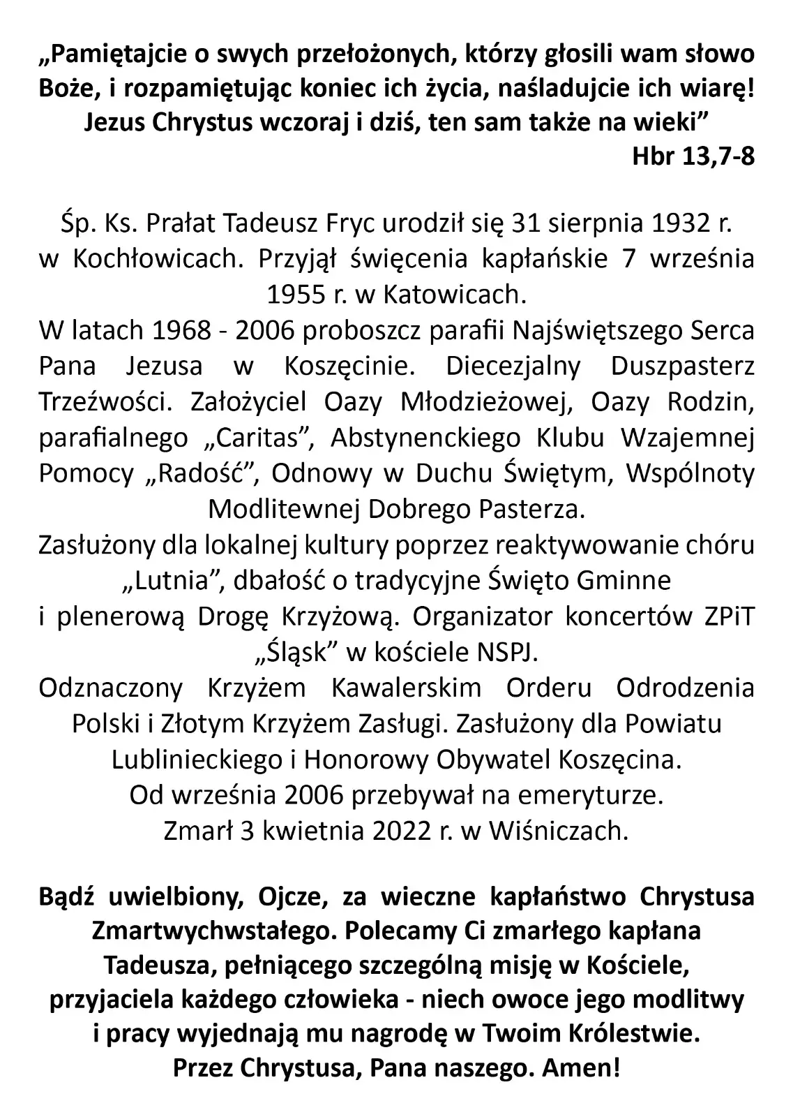 Parafia NSPJ w Koszęcinie wydała wspomnienie o śp. ks. prałacie Tadeuszu Frycu i Jego rodzinie. Autorem książki jest Jan Myrcik, przyjaciel śp. księdza. W publikacji, która jest wydaniem pamiątkowym, znajdują się ciekawe, niepublikowane dotąd wspomnienia i zdjęcia z rodzinnego albumu emerytowanego proboszcza koszęcińskiej parafii.