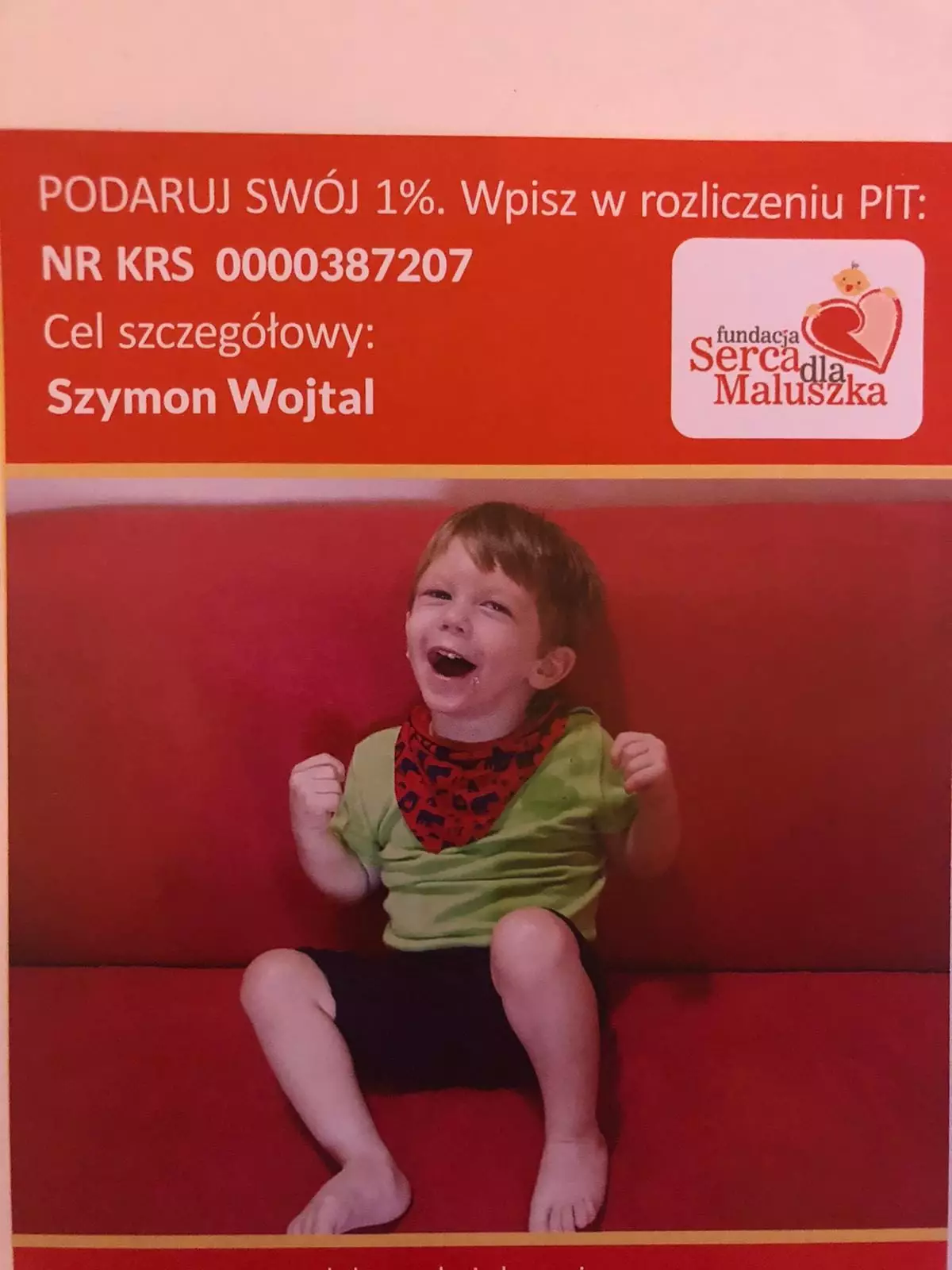Zwracam się z prośbą o przekazanie 1% podatku na rzecz Szymona. Dziękuję Wszystkim, którzy pamiętali o nas w zeszłym roku. Wasze wsparcie pozwala na codzienną rehabilitację i systematyczne turnusy dla Szymona